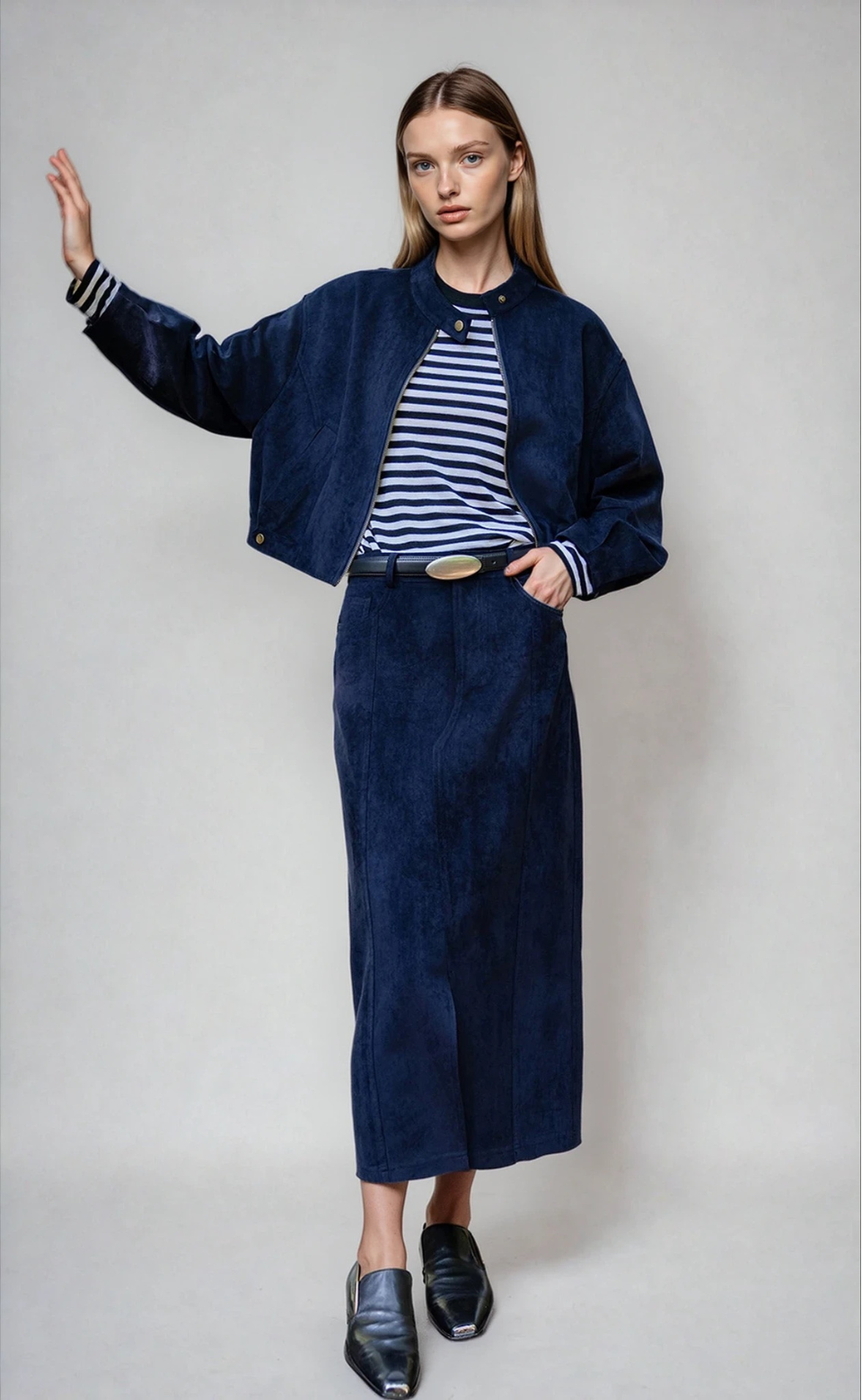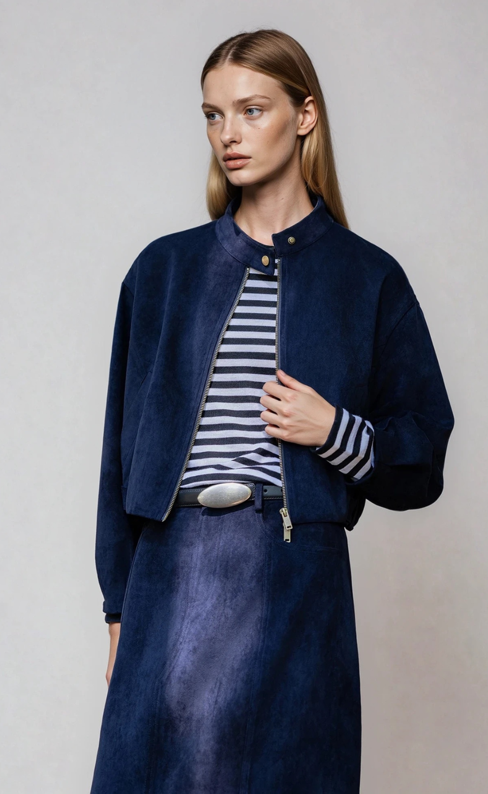 A modern take on a classic silhouette. Crafted in soft suede with a relaxed, cropped shape, this bomber jacket blends structure with effortless ease. Clean lines, subtle volume, and refined detailing give it a polished yet undone feel — perfect for everyday layering.
