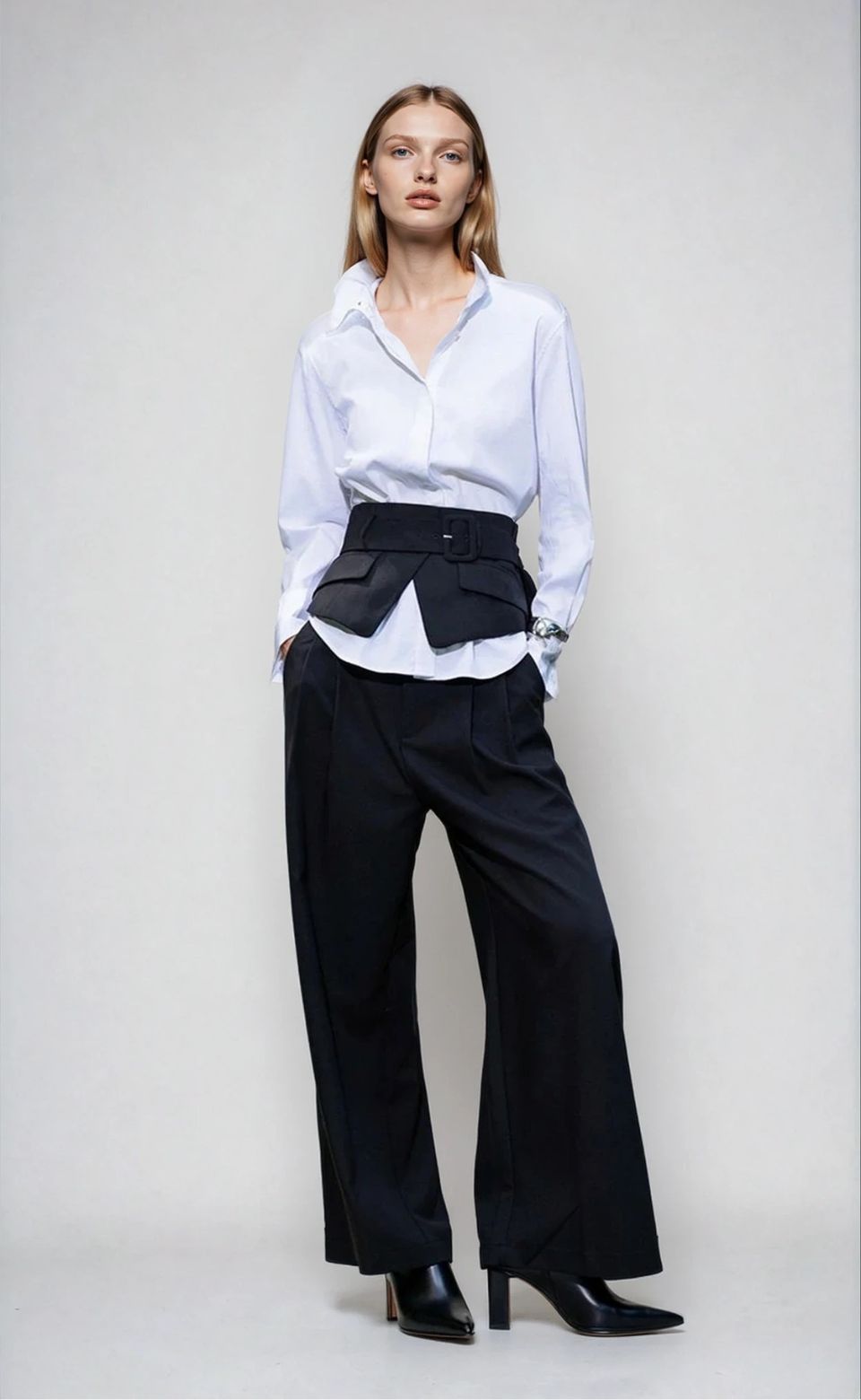A crisp white cotton shirt with a tailored silhouette and sharp collar. Elevated by a contemporary belt-inspired waist detail, it blends timeless structure with bold, modern attitude.