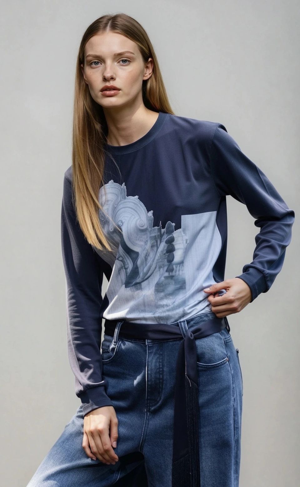 These high-waisted wide-leg jeans are designed with a fluid, elongated silhouette that moves effortlessly with every step. The standout detail is the extended belt accent — a long, draped tie that adds dimension, edge, and contemporary attitude.