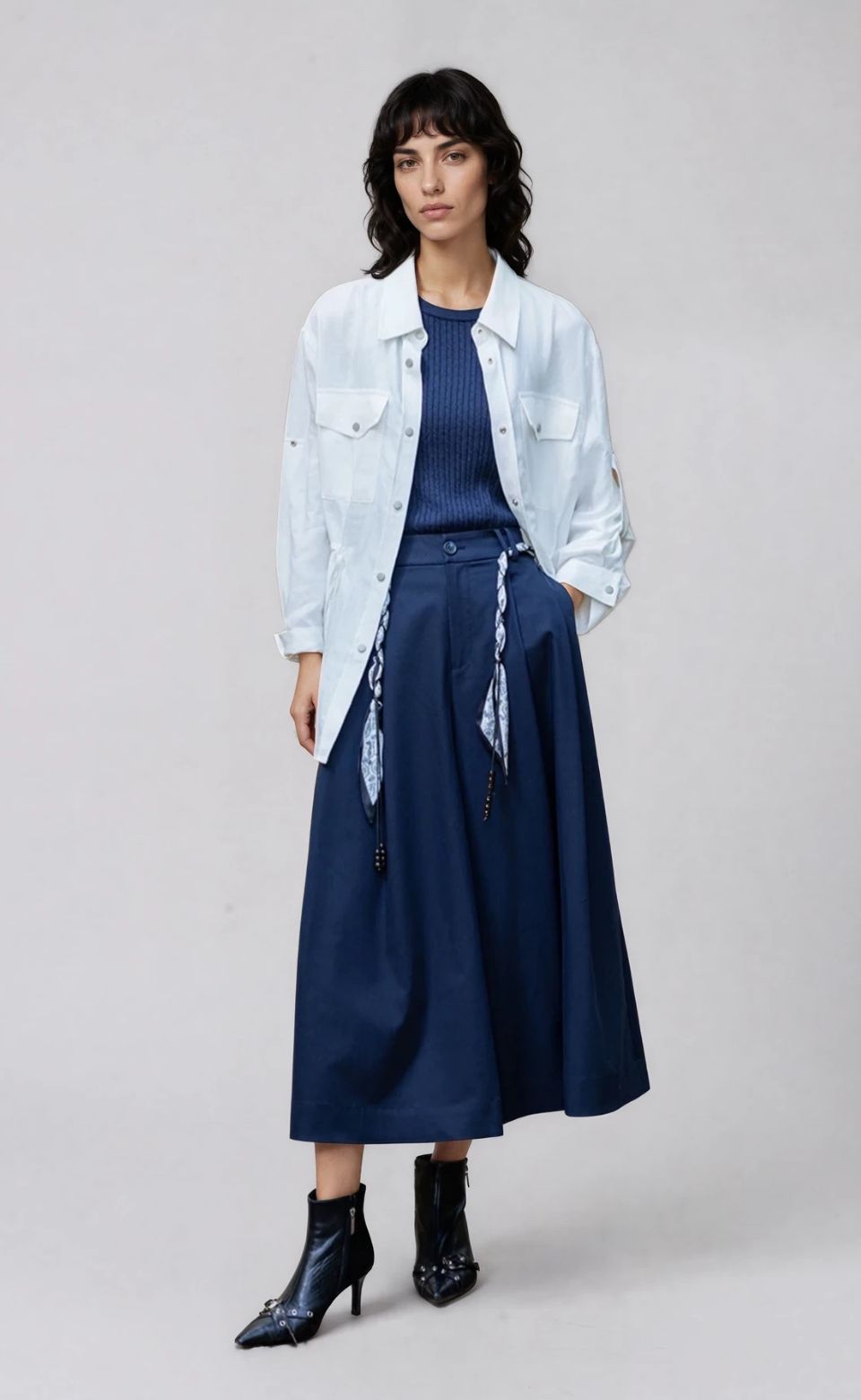 A statement culotte designed with fluid volume and modern structure. Crafted in a smooth fabric blend, this wide-leg silhouette features an detachable scarf-tie detail at the waist for soft movement and subtle drama. Tailored through the waistband and flowing through the leg, it blends elegance with contemporary edge—perfect styled with boots or sleek heels.
