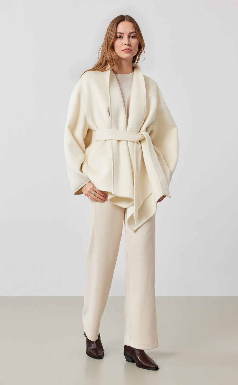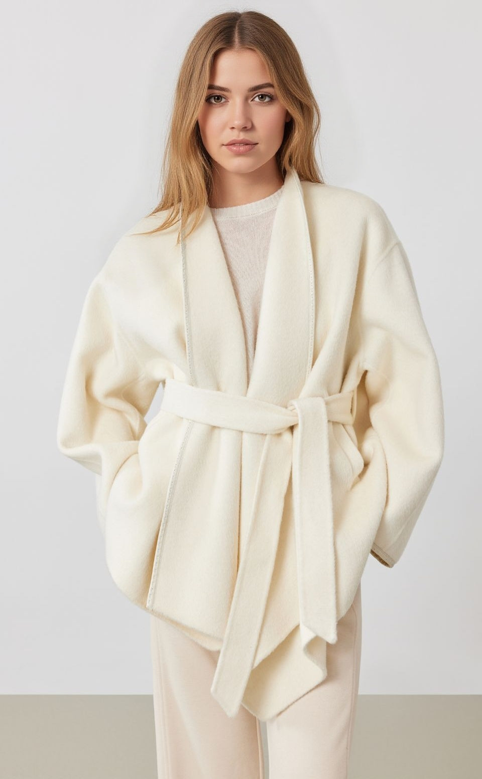 Effortlessly refined, this minimalist wrap coat drapes with quiet sophistication. Crafted in a soft cream hue, it features a clean belt silhouette that cinches at the waist for a flattering shape while keeping the lines sleek and streamlined. The wool-blend fabric elevates the feel, offering both warmth and an understated elegance that transitions smoothly from office hours to weekend escapes.
