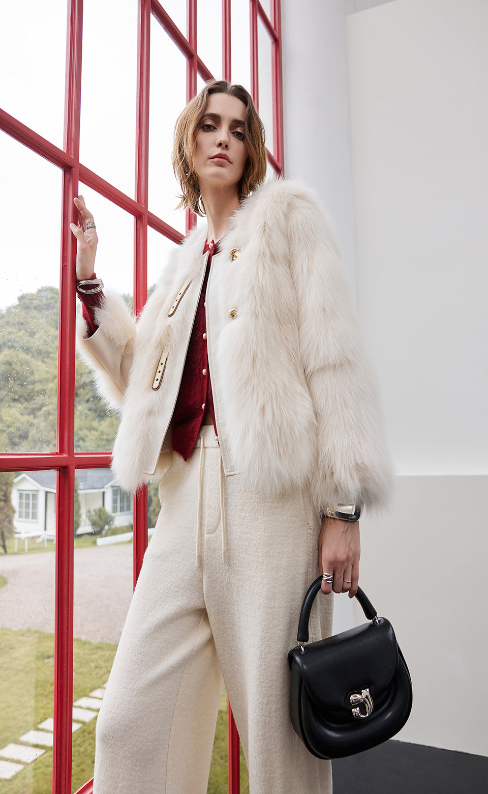 •  Luxurious genuine fox fur jacket with a dramatic, high-fashion silhouette