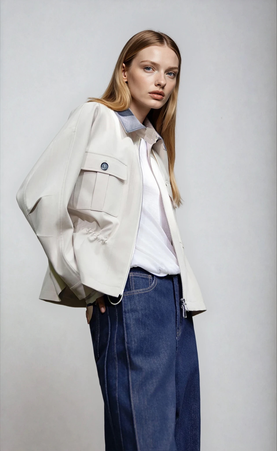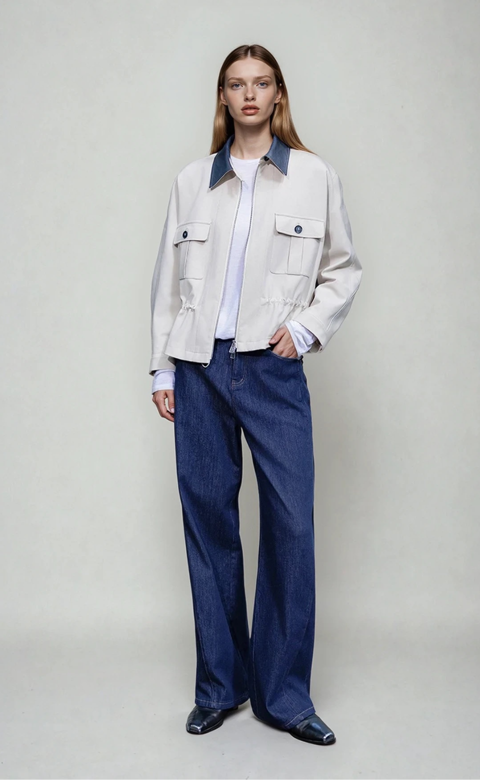A cropped utility jacket with a sharp, modern attitude. Designed with a contrast collar, structured pockets, and a subtly cinched waist for definition. Lightweight, effortless, and made to layer—off-duty edge with a polished finish..