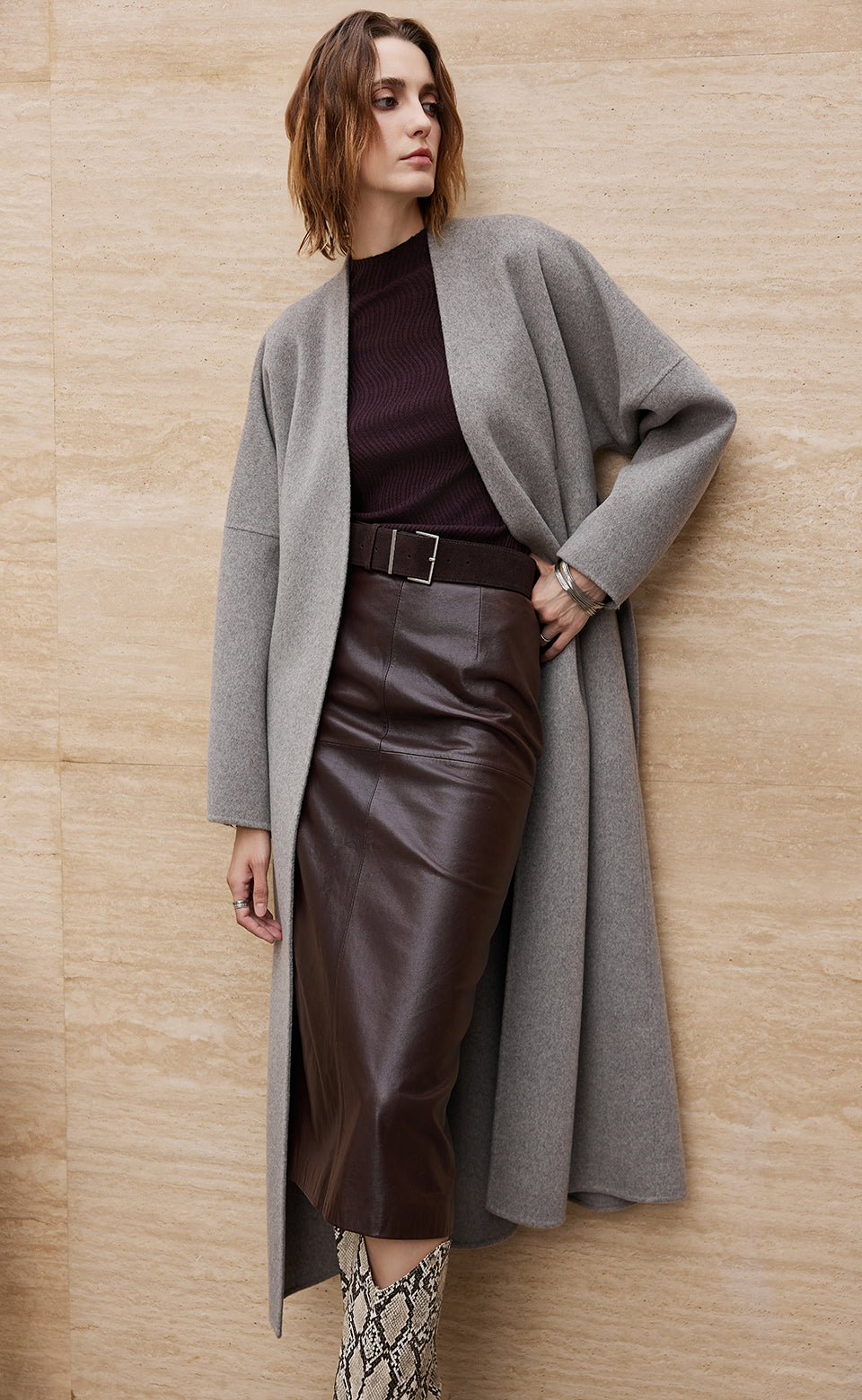 A sleek faux-leather pencil skirt designed in a rich, burgundy tone for a luxe, modern feel. The clean seam lines and tailored silhouette create an elongating, sophisticated look, while the mid-length makes it perfect for both work and evenings out. Effortlessly chic paired with knits, blouses, or oversized outerwear.