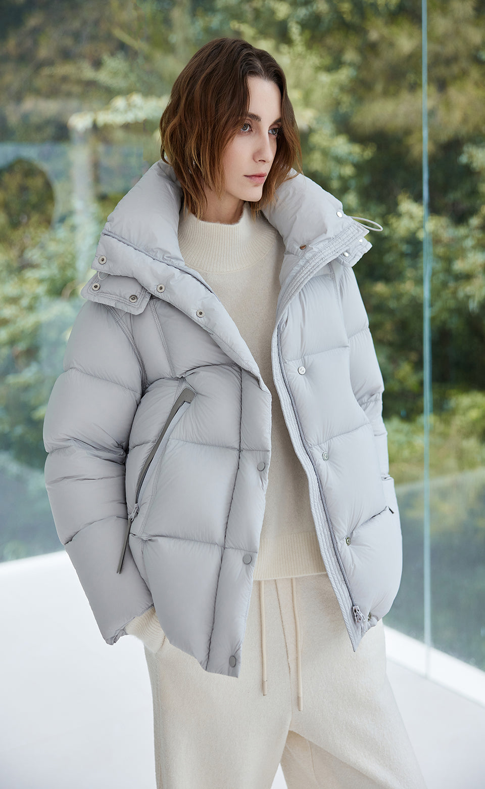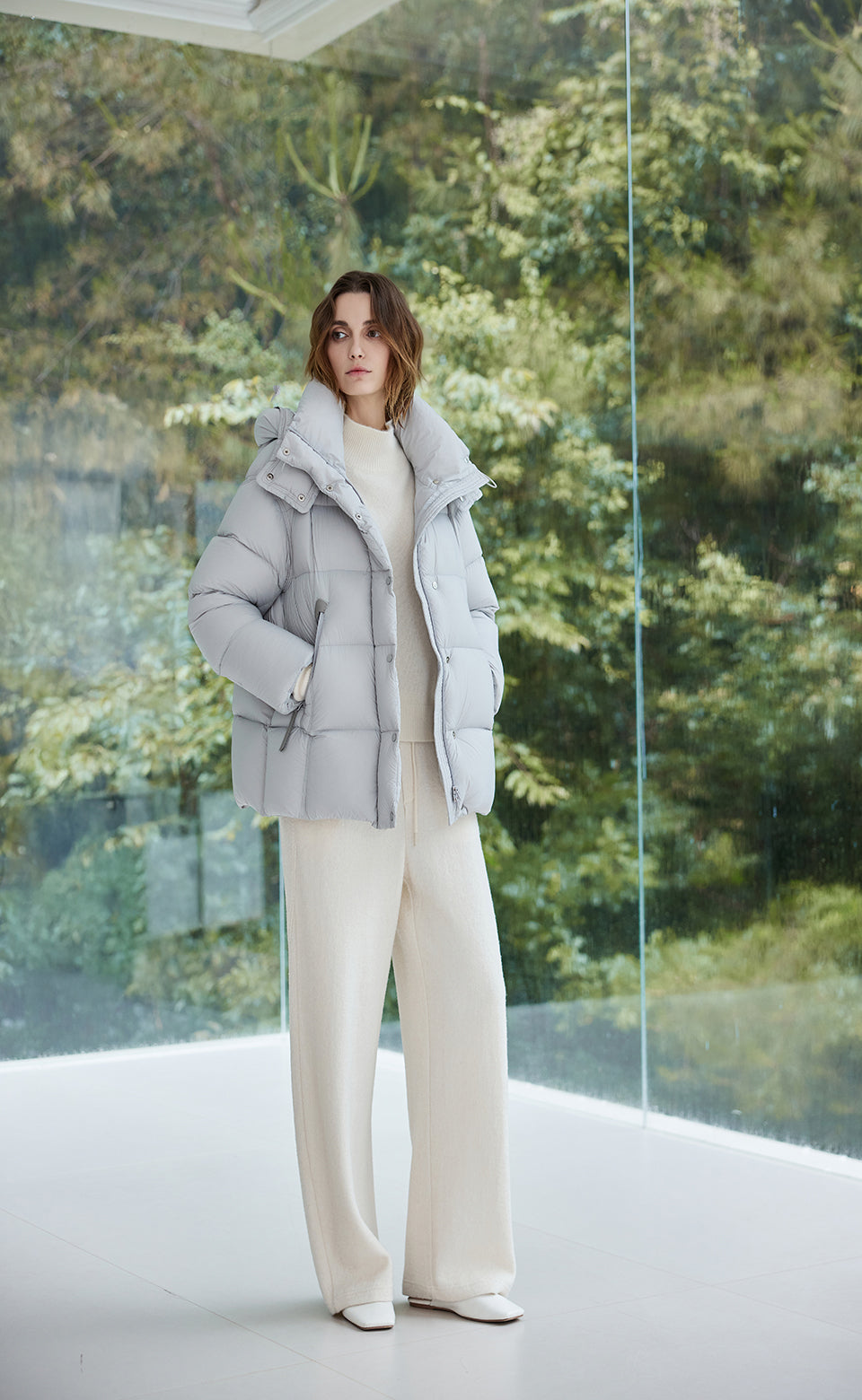 •  Modern light grey color statement for timeless, sleek winter dressing